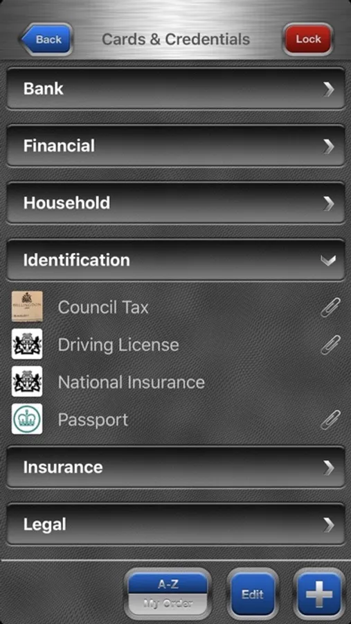 • Cards & Credentials – store all your private files, credit cards, bank details, original documents, completely customizable data fields to create a database