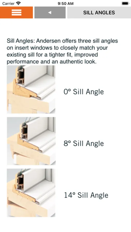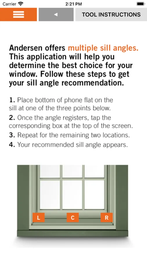 The Andersen Sill Angle Finder app helps you determine the sill angle (sill slope) of an existing window. Knowing the existing sill angle will help determine which sill angle you should select when ordering Andersen® replacement double-hung windows.