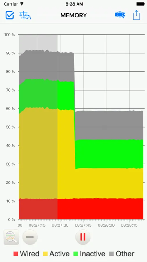 - Memory : Fee space ratio wired, active, inactive and free memory usage