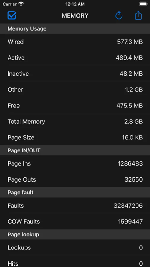 - Memory Usage : wired, active, inactive, other, free, total memory and page size usage