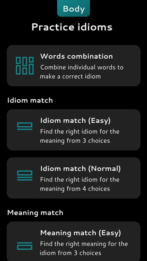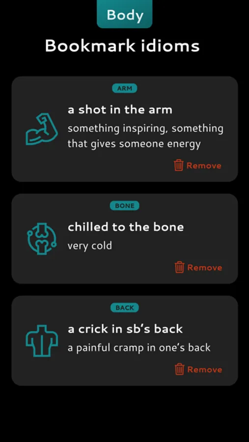 - Add an idiom into your favorite list and manage all your favorite idioms.