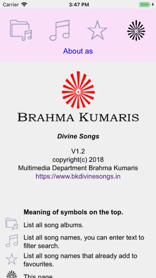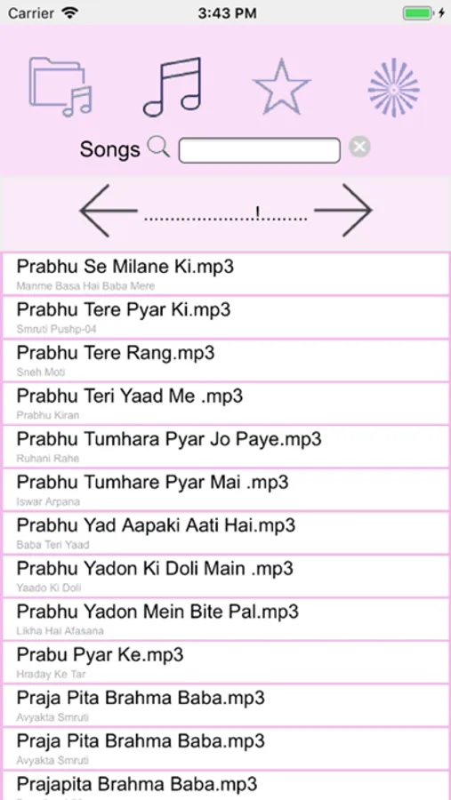 This App is used for playing music that related stories (in Hindi) that create intoxication to the students of Brahma Kumaris World Spiritual University which is a spiritual institution focused on self-transformation through spiritual education and reflective practices. (www.brahmakumaris.com)