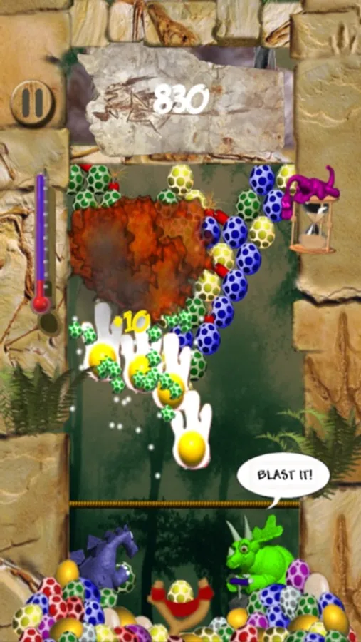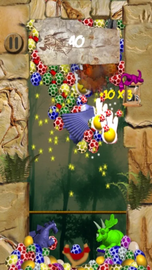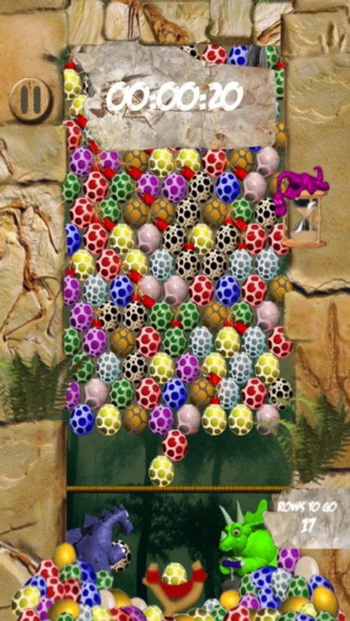 If the mass of eggs descend to the bottom of the screen, the entire screen will be crushed by the foot of Mama Brontosaurus, and the game will end.