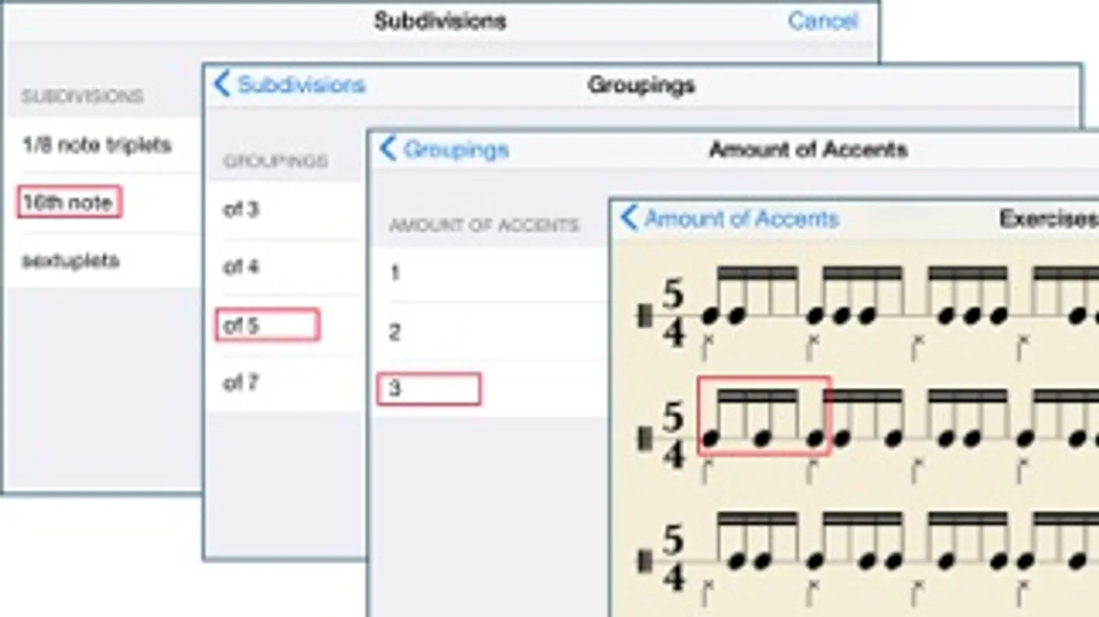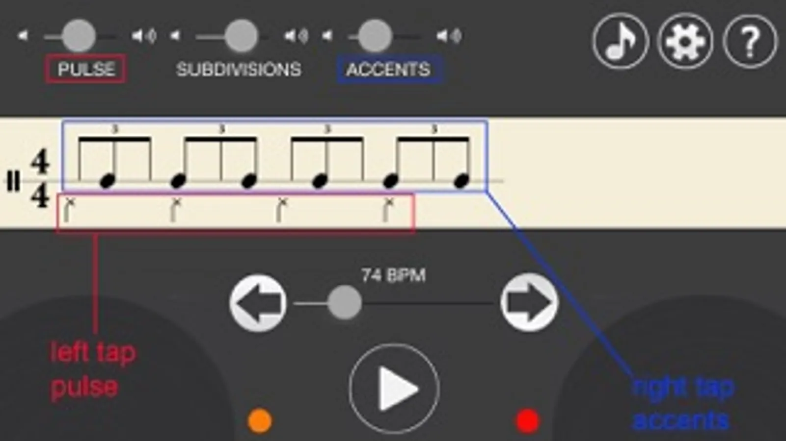 Train each position (accent) of a subdivision and the sound created in relation to the basic pulse. For that you can use one of the tap buttons to play pulse and the other to play the accents. (Left or right can be adjusted)