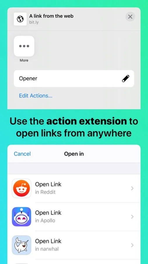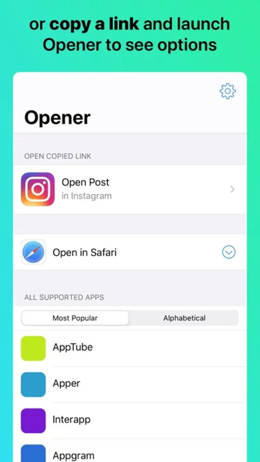 Opener is an app that allows you to open links from the web in apps instead! Copy a link and launch Opener to see the apps that it can be opened in, or use Opener's action extension right from other apps! Opener currently supports over 280 apps with more being added all the time.
