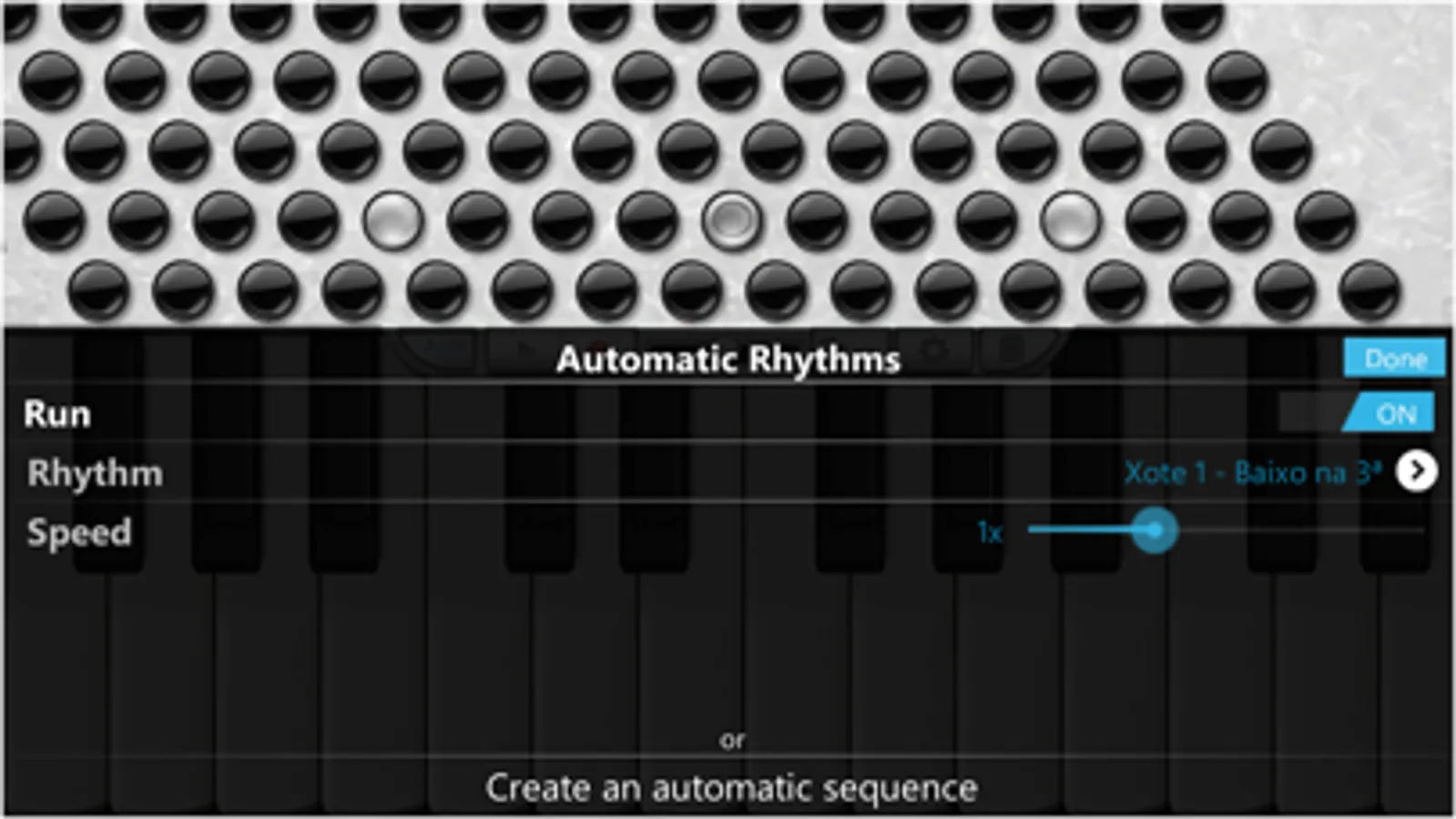 Learn about the accordion basses with our unique system of "Automatic Rhythms" - With this you can make a sequence of chords, choose a rhythm, and the application will automatically execute it on the accordion basses, while so you can train their melodies and harmonies, and can learn new rhythms in the accordion basses, all with compass measurement at the correct time.