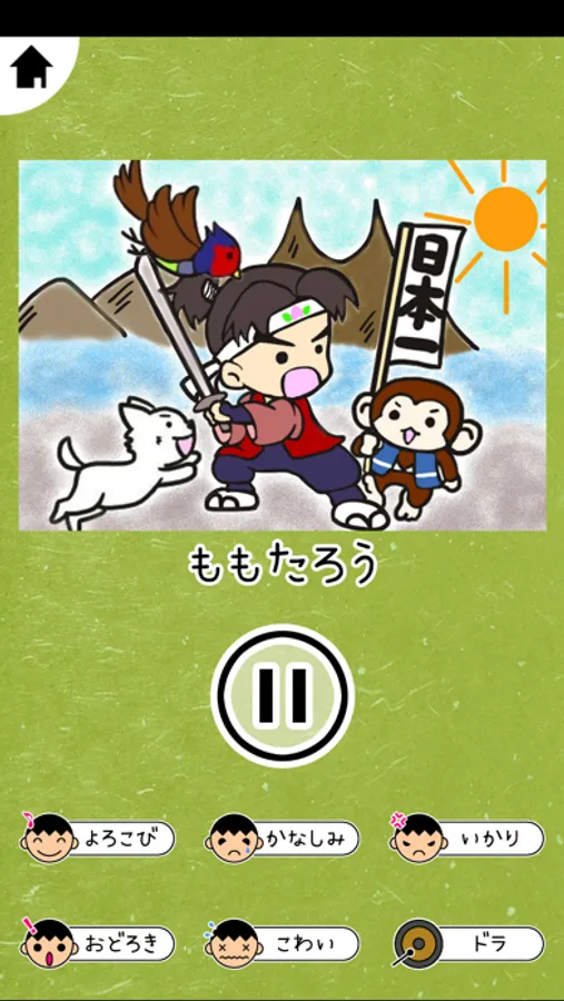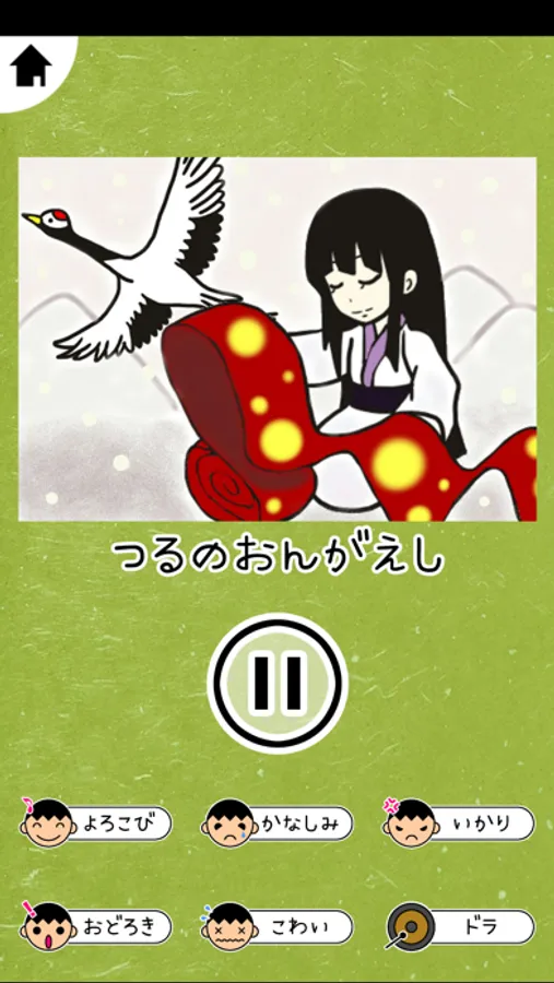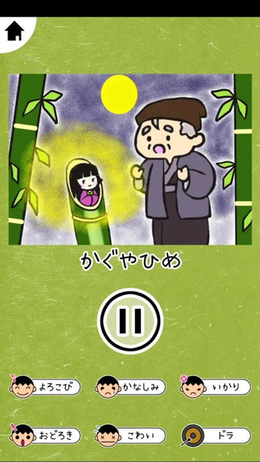 また、画面の下部には「効果音」のアクションボタンが並んでいます。よろこび、かなしみ、いかり、おどろき、こわい、ドラの6個の音を配置されています。各ボタンを押すと効果音が流れますので、シーンに合った音を流して、物語を盛り上げてください。一時停止機能と、再開機能もついていますので、いつ席を立っても大丈夫です。