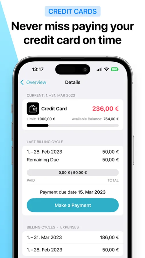 √ Credit Card Tracking - Manually add and manage your credit cards, set up reminders to pay them and more