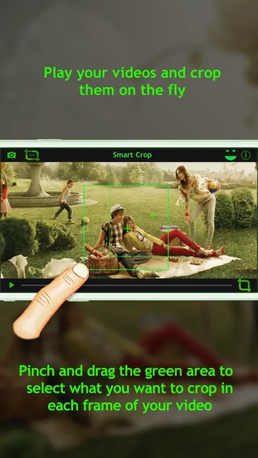 • Crop your videos on the fly, frame by frame, while you play them: pinch and drag the green area to select what you want to crop in each frame of your videos