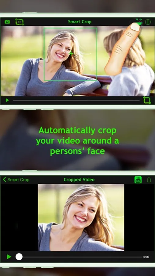 Smart Crop is the only app of the AppStore that lets you crop your videos on the fly, frame by frame, while you play them: Play your videos, and move and scale the green area to select what you want to crop in each frame of your videos.