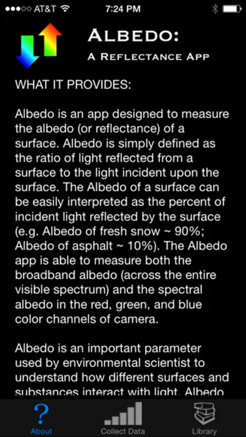 Albedo is an app designed to measure the albedo (or reflectance) of a surface. Albedo is simply defined as the ratio of light reflected from a surface to the light incident upon the surface. The albedo of a surface can be easily interpreted as the percent of incident light reflected by the surface (e.g. Albedo of fresh snow ~ 90%; Albedo of asphalt ~ 10%). The Albedo app is able to measure both the broadband albedo (across the entire visible spectrum) and the spectral albedo in the red, green, and blue color channels of camera.