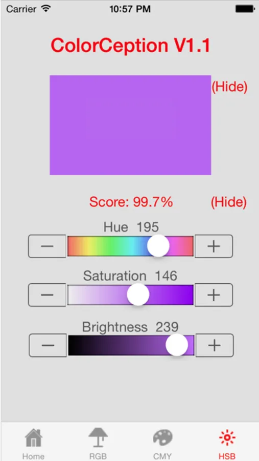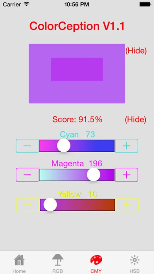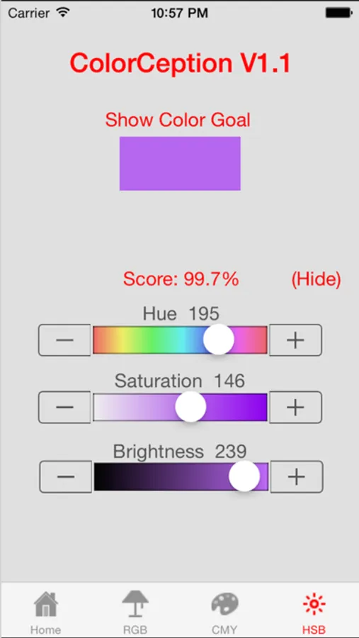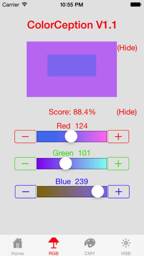 ColorCeption - a color perception challenge for the iPhone and Apple Watch. Ten free colors; RGB, CMY and HSB modes.