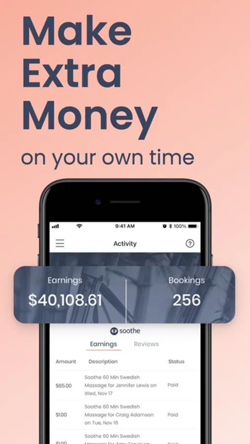 Freedom to work when and how often you want. The Soothe platform helps maximize your revenue by using your location and availability to connect you to a steady stream of clients to grow your business.