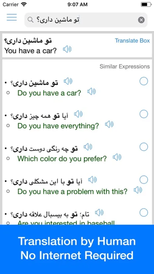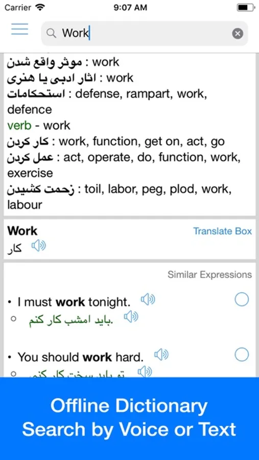 English to Persian, Farsi to English Translator & Dictionary app with ability to search similar sentences & expressions.