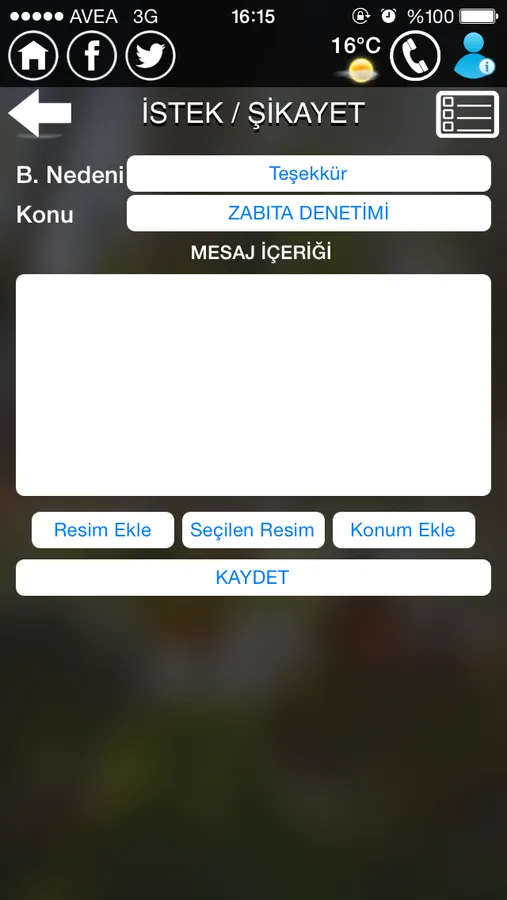 - İstek/Şikayet: İstek veya şikayetlerinizi resim ve konum belirterek gönderebilir, daha önce yapmış olduğunuz istek şikayetleri sorgulayabilirsiniz.