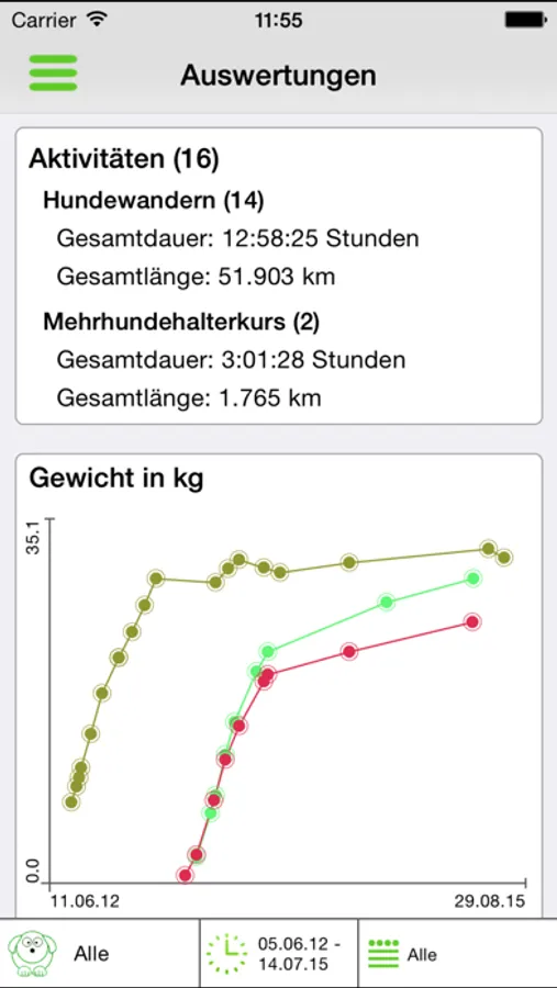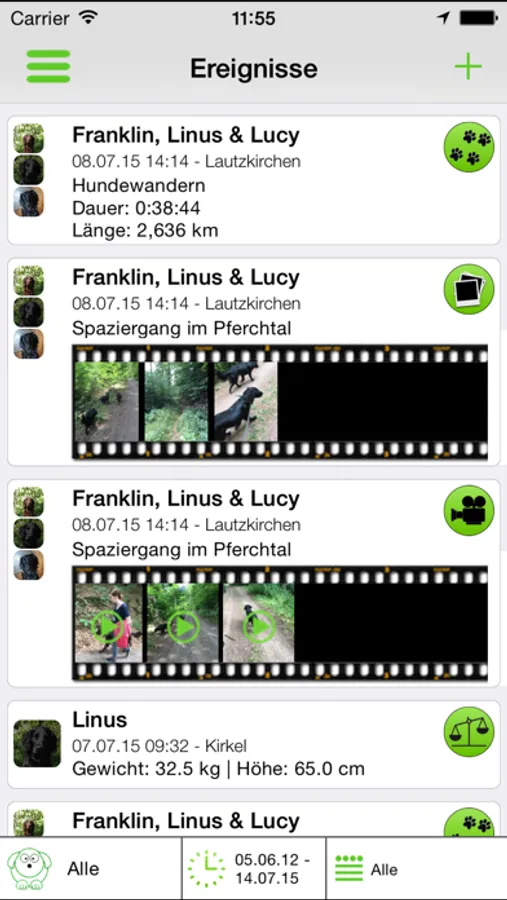 Auf der Startseite bekommst du einen Überblick über alle Ereignisse, z.B. Körpermaße, Aktivitäten, Tierarztbesuche, Fotos und mehr. Möchtest Du es noch übersichtlicher, kannst du auch Filter setzen.