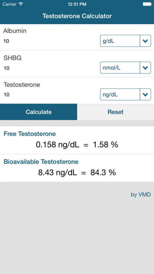 Once lab values are in place, press the calculate button and let the Free & Bioavailable Calculator app do the math.