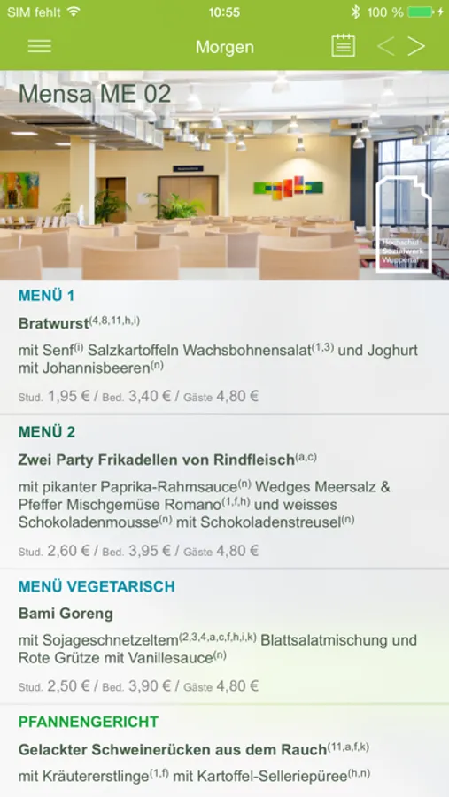 • Menus: Get menus from the canteens, cafeterias, cafes and restaurants of all three sites. You can set your own “favourite canteen”.