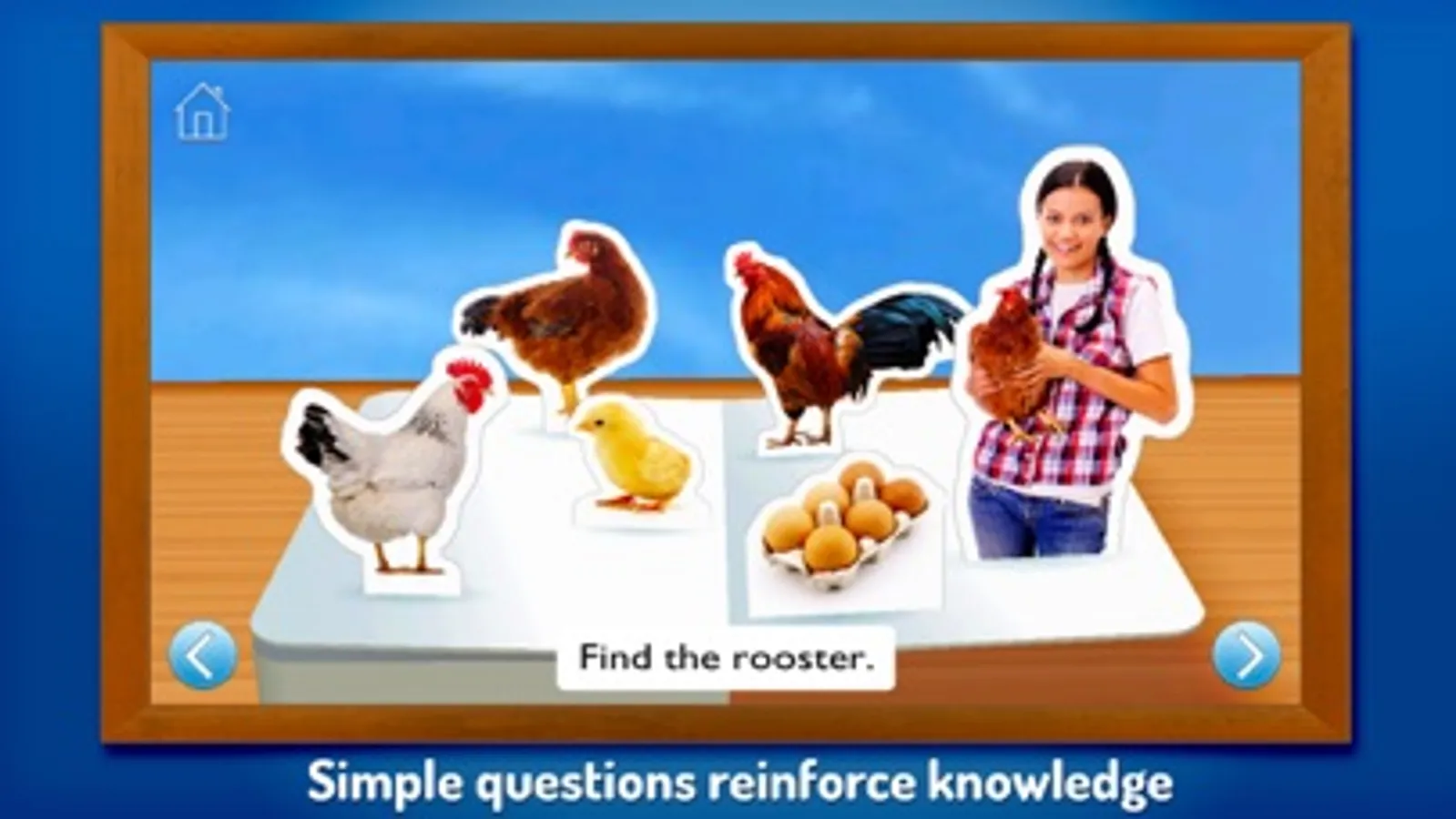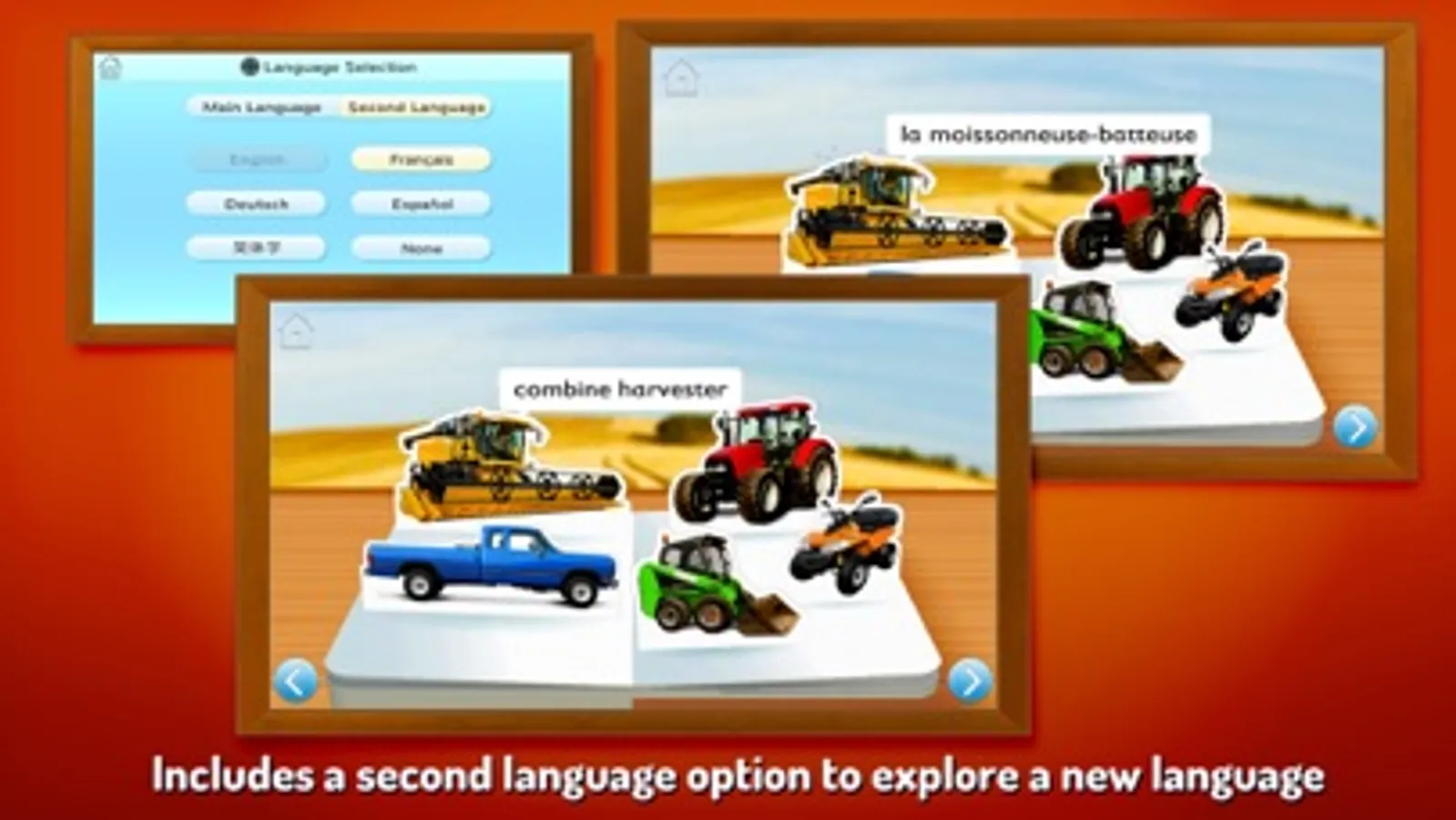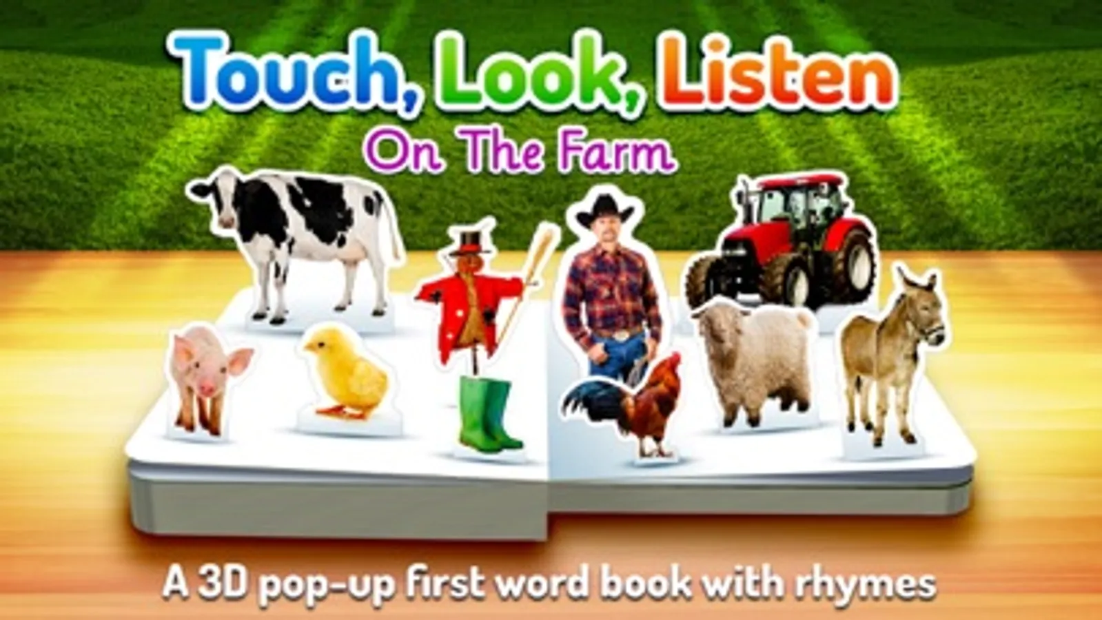 On the Farm is just like a real book, so it’s easy to find your way around. Each page is introduced by a playful rhyme, while bright and colorful images pop-up magically as each 3D scene opens. When your child taps a picture, they see and hear the associated word, making this a powerful tool for learning new words as well as reinforcing those they already know. With the second language option, they can explore other languages too, including Spanish, Chinese, French and German.