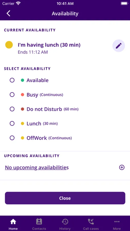 Availability management - Change your status when you are busy, away, on lunch, on vacation and so on. Your colleagues can see immediately if you are available. You can also schedule upcoming availabilities for meetings or when out of office.