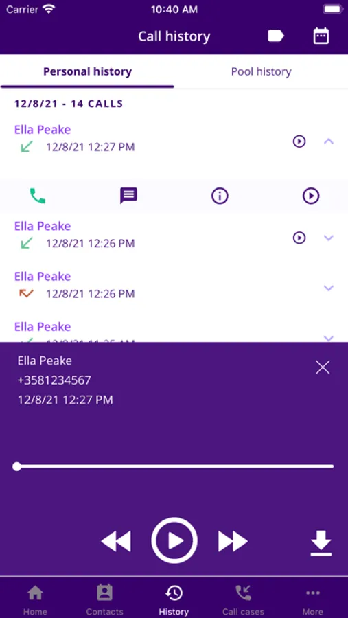 Personal call history - View who called you and when. Play back the call recording or send an SMS or just call a missed contact.