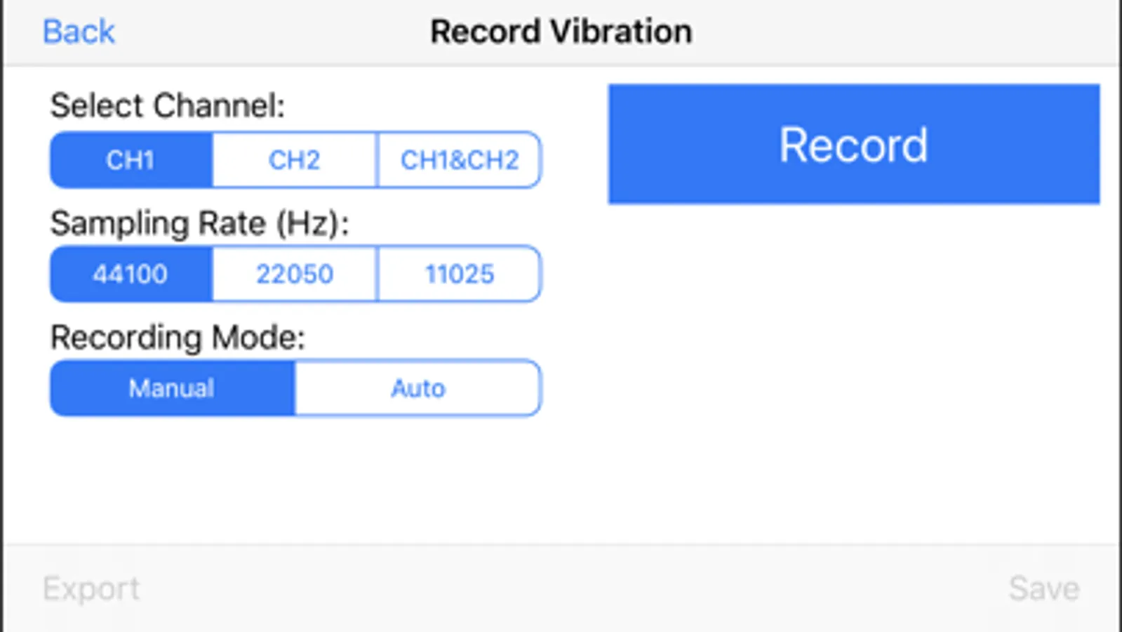 NOTE: this App needs Motionics single channel accelerometer to operate. Please contact Motionics for hardware information.