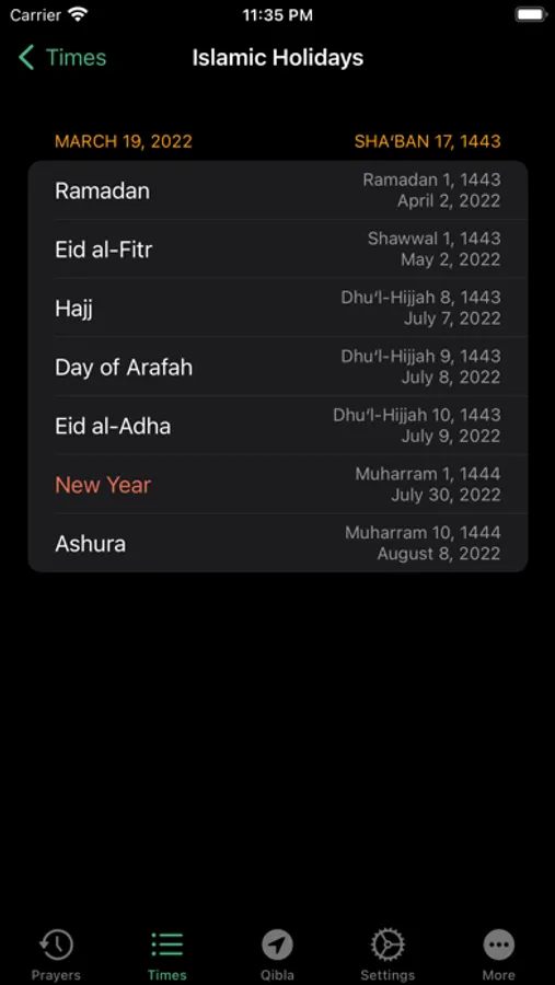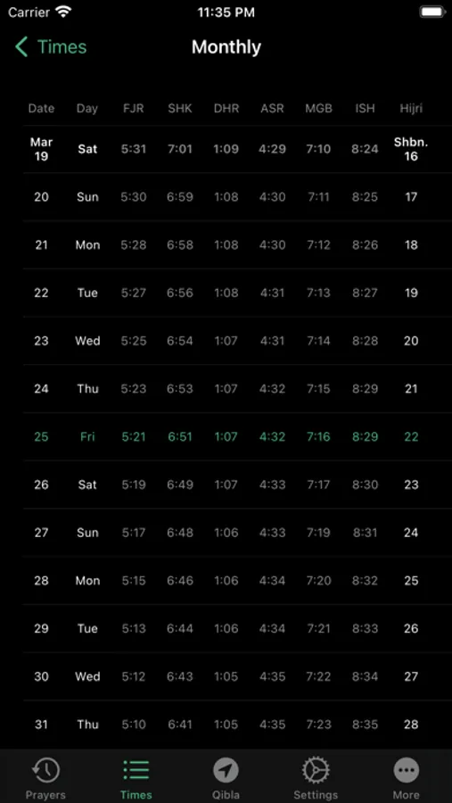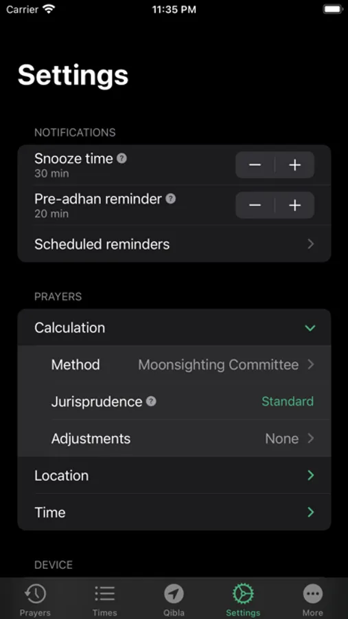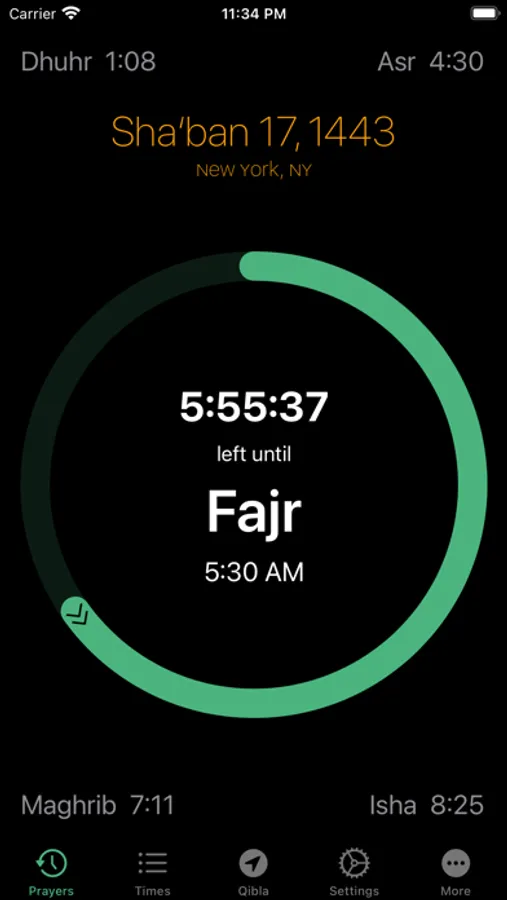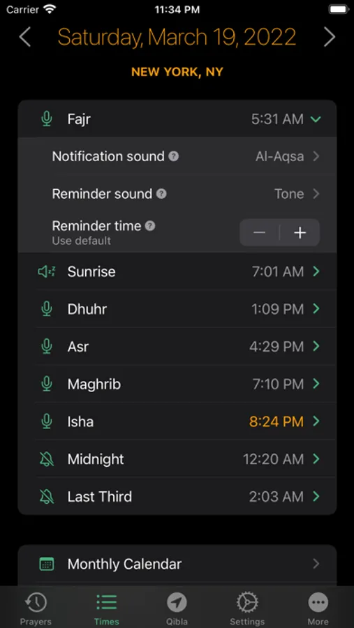 - Prayer times list includes “Midnight” and “Last Third” to help you plan for tahajjud and qiyam