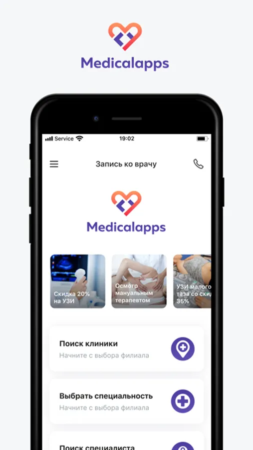Основные разделы MedicalApps: Онлайн запись - в ближайшее отделение к нужному Специалисту в удобное время в 5 прикосновений
