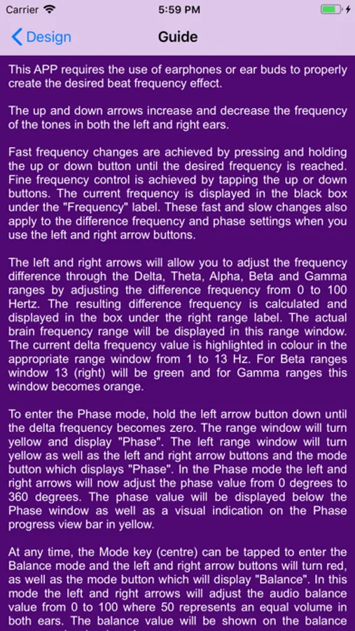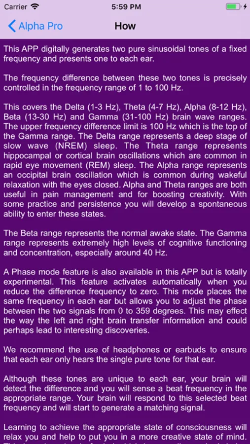 Learning to achieve the appropriate state of consciousness will relax you and help to put you in a more creative state of mind. This is a deep level of mind which is normally reached during prolonged meditation. Relax, be patient and experiment to find the right tones that relax you. The Alpha range is great for getting into a creative state whereas the Theta range is best for deep relaxation. The Delta range will help you to achieve deep sleep. Read about these states on the internet and experiment with them using this App. You can fully customize the frequencies to match your needs. This you will learn through experimentation.