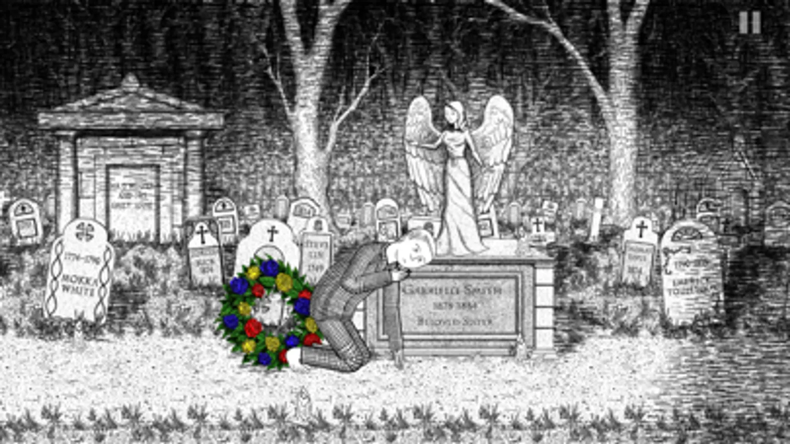 * Black and white artwork creates a distinctive moody and dark atmosphere.