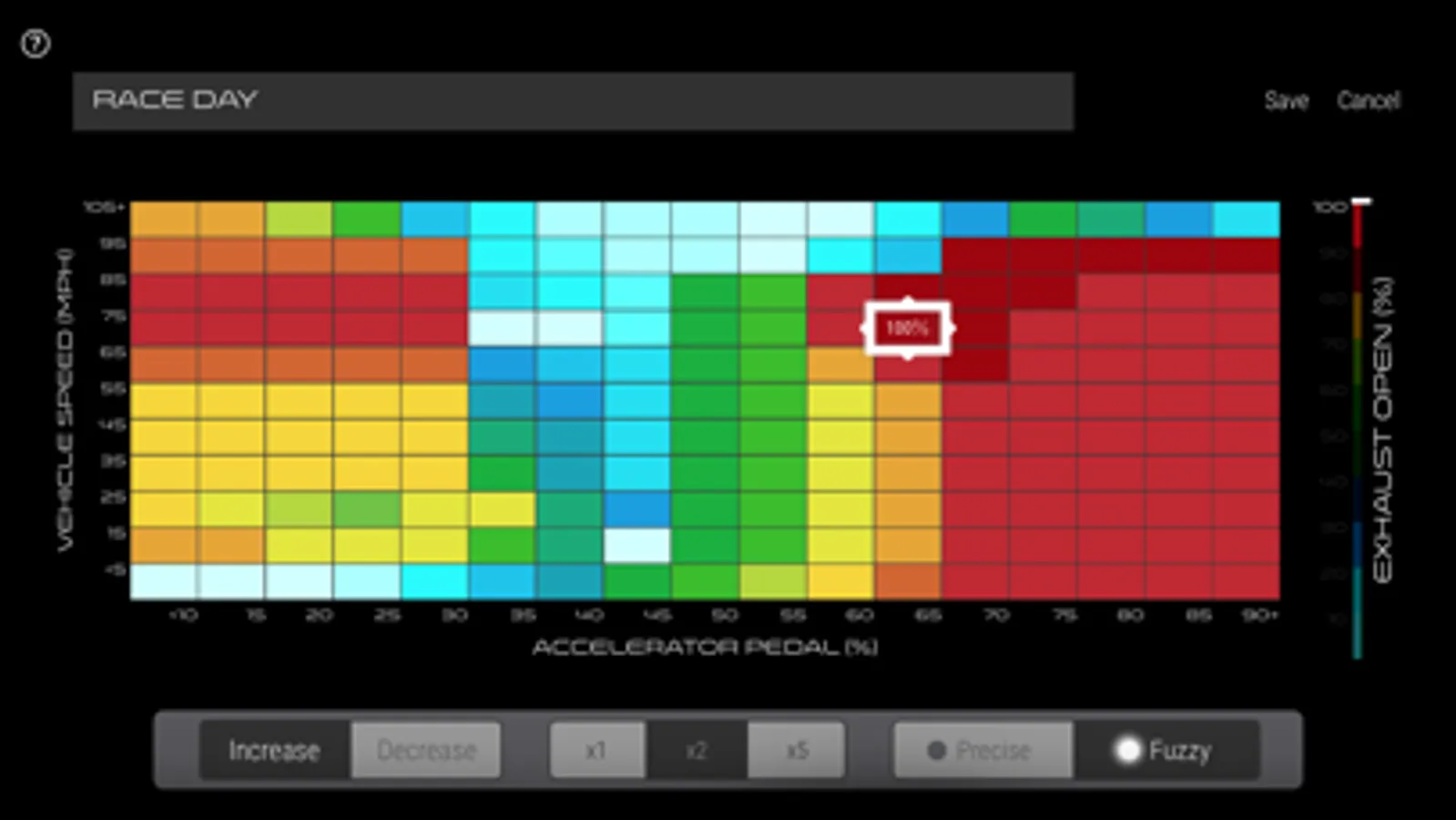 • CUSTOM TUNE: It is possible to personalize the exhaust sound under this switch setting. This unique calibration is done by the end user via this mobile application and a WiFi dongle connected to the vehicle’s diagnostic connector. You have full access to how much the valves open and close based on vehicle speed and accelerator position. The application allows full range tuning based on customer wants based on vehicle input.