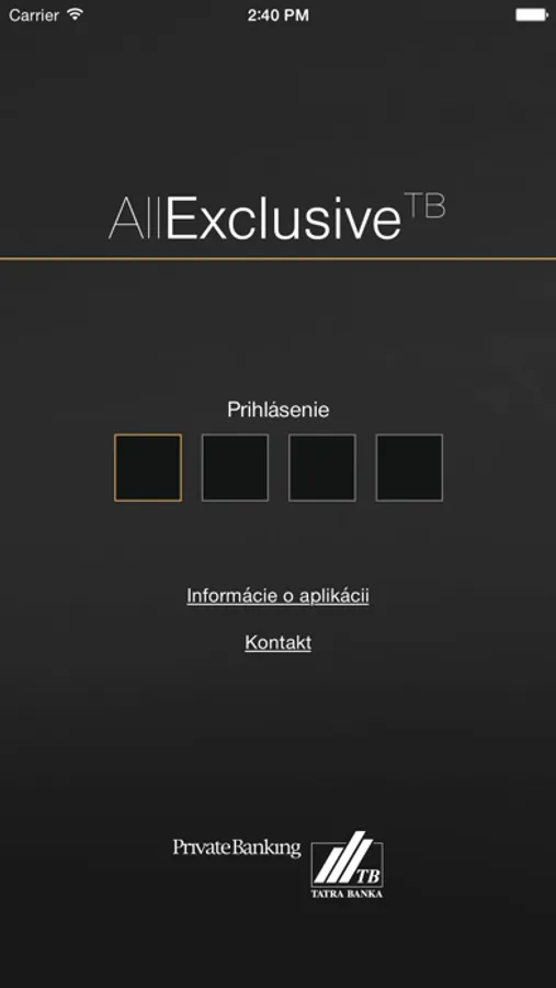 Pri prvom spustení aplikácie sa vám zobrazí pole na zadanie 4 miestneho PIN kódu. Pre jeho získanie prosím kontaktujte svojho privátneho bankára. Overenie heslom je jednorazové a po úspešnom prihlásení už PIN kód nie je vyžadovaný.