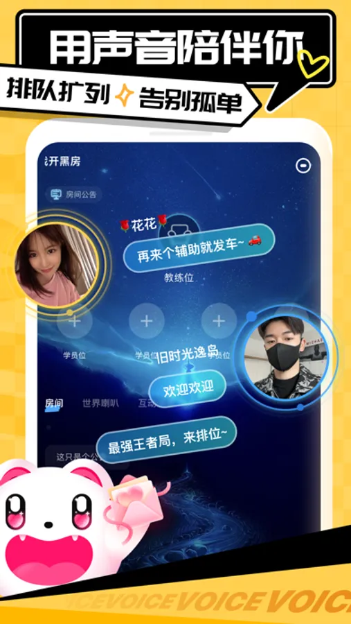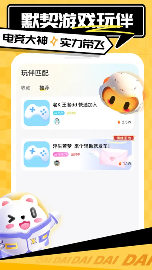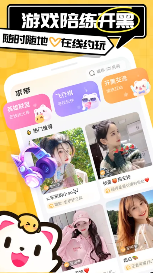 热门游戏全支持(英雄联盟、PUBG、LOL手游、绝地求生、王者荣耀、云顶之弈、DNF、穿越火线等),提供游戏陪玩、陪练、代练等开黑服务;一键速配组队开黑,找到你的电竞soul玩伴,超多小姐姐给你比心哦!