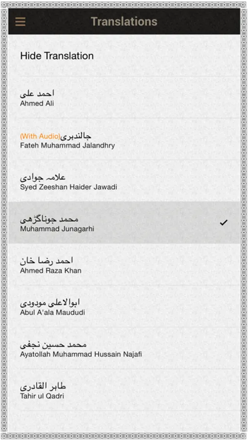 • Complete list of translators is Ahmad Ali, Fateh Muhammad Jalandhry, Syed Zeeshan Haider Jawadi, Muhammad Junagarhi, Ahmad Raza Khan, Abul A`ala Maududi, Ayatollah Muhammad Hussain Najfi, Tahir ul Qadri.