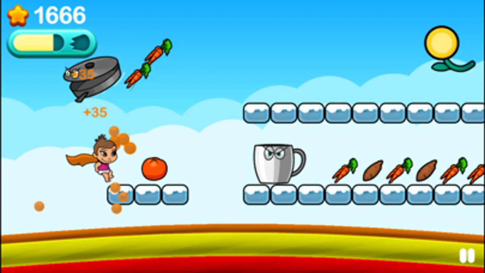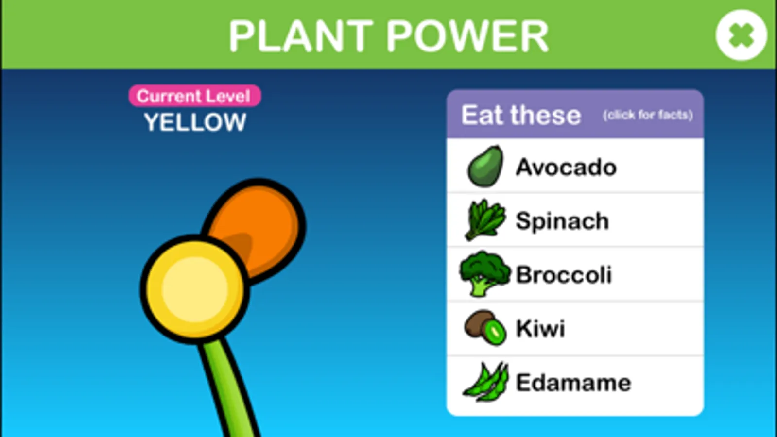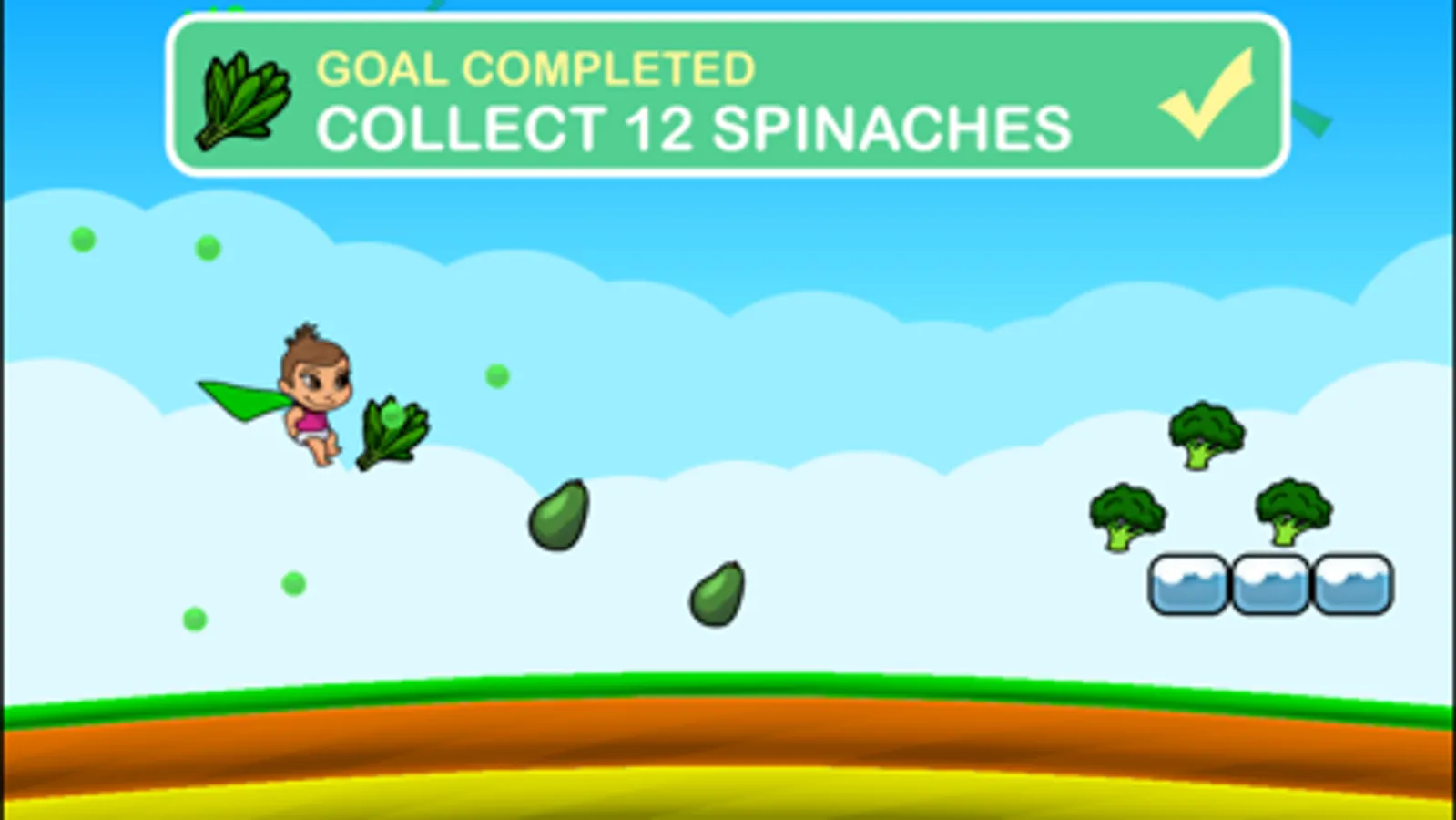 Super Baby Abigail, a Super Crew ®kid, travels through 8 different colored levels of Rainbow Road catching and collecting healthful, colorful foods while outsmarting hostile kitchenware (tea cups, tongs, spoons). Each healthful food gives a dose of antioxidant power to boost Abigail’s speed to leap over or fly through the obstacles and move faster to the next level. As she completes each color’s level of Rainbow Road, Abigail unlocks fun and tasty facts for each food captured on that level.