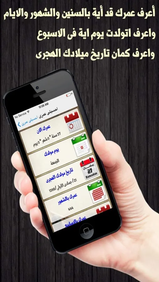 يقوم هذا التطبيق بعد ادخال تاريخ ميلادك بحساب عمرك بالسنوات والاشهر والاسابيع والايام بل وبالساعات أيضا كما يعطيك ايضا توقيت ميلادك فى ايام الاسبوع وتاريخ ميلادك الهجرى