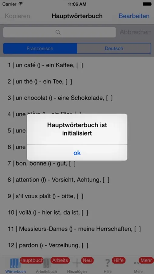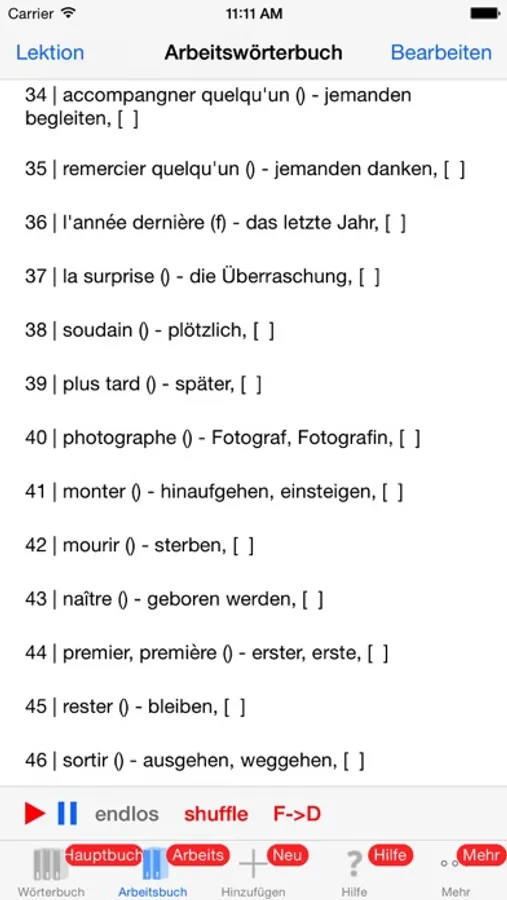 Das Wörterbuch ist durch Hinzufügen von eigenen Vokabeln wie sie im Alltag oder in den Lektionen eines anderen Kurses auftreten beliebig erweiterbar. Kleine Lerneinheiten können in ein Arbeitsverzeichnis kopiert und per Sprachausgabe immer wieder vorgelesen werden. Abspielen in zufälliger Reihenfolge verhindert, dass sich die Wörter nur durch die Reihenfolge einprägen. Am Ende Ihres Sprachkurses haben Sie den ganzen Wortschatz zur Verfügung. Die Datenbank kann über den iCloud Drive auf ein anderes Gerät portiert werden.
