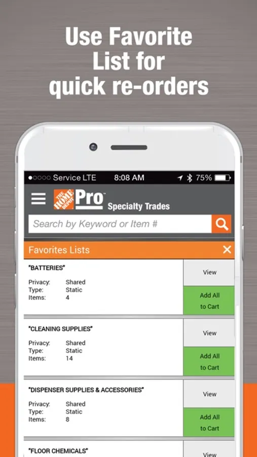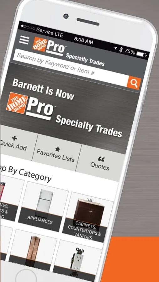 The Home Depot Pro Specialty Trades app lets you purchase items from your saved favorites list or customized product offering, as well as create, manage and approve quotes on the go.