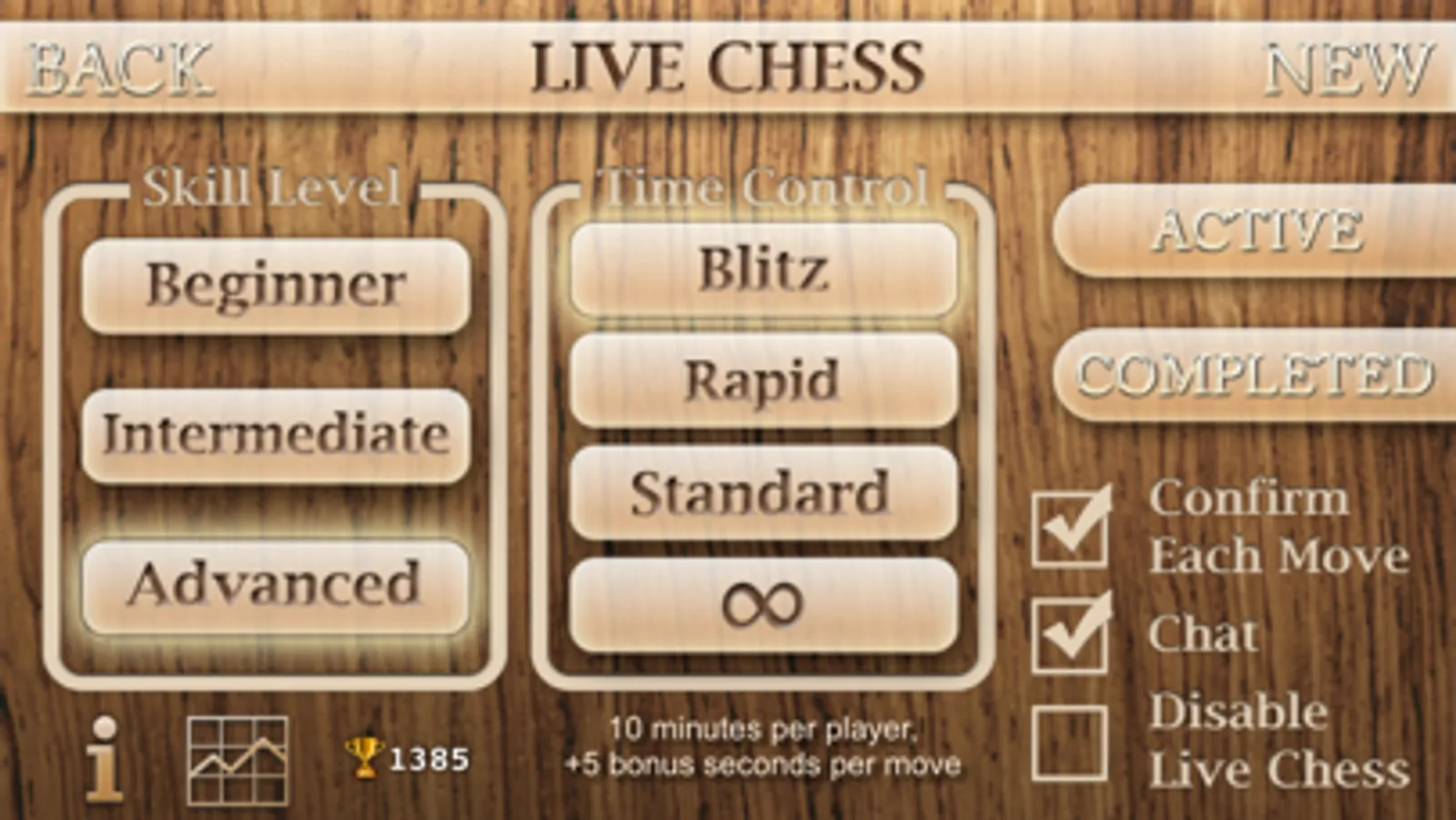 • LIVE CHESS - invite your friends and play online. Or just play with a random player. Three difficulty levels, four time control settings, rating system, statistics and more. Confirm your move before submitting. Communication options - In-Game Chat, Rematch, Undo Move, Offer Draw, Resign, Postpone Match.