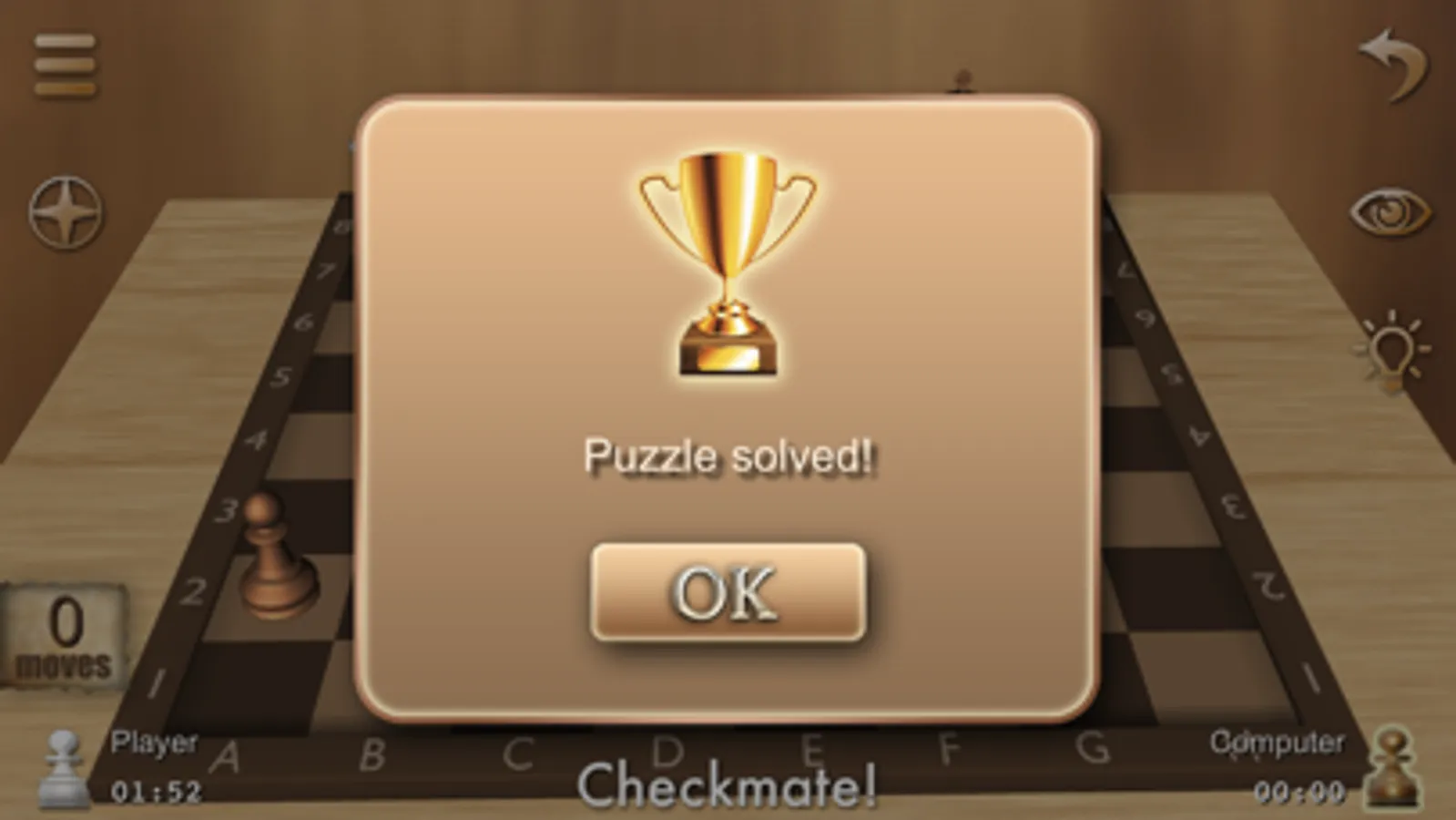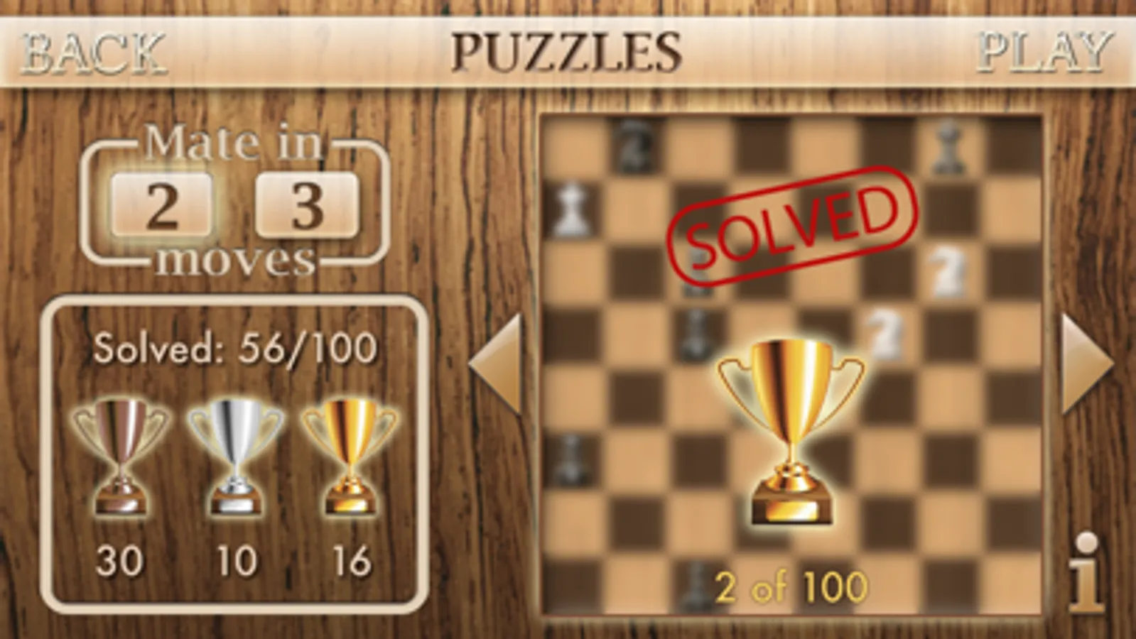 • 200 ‘Mate in 2’ / ‘Mate in 3’ puzzles with stats, rewards and hints.