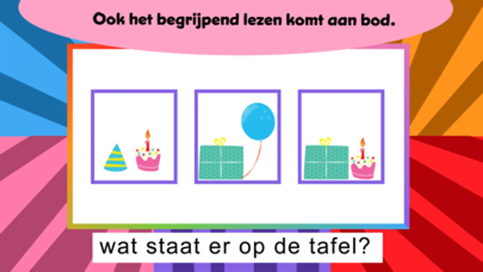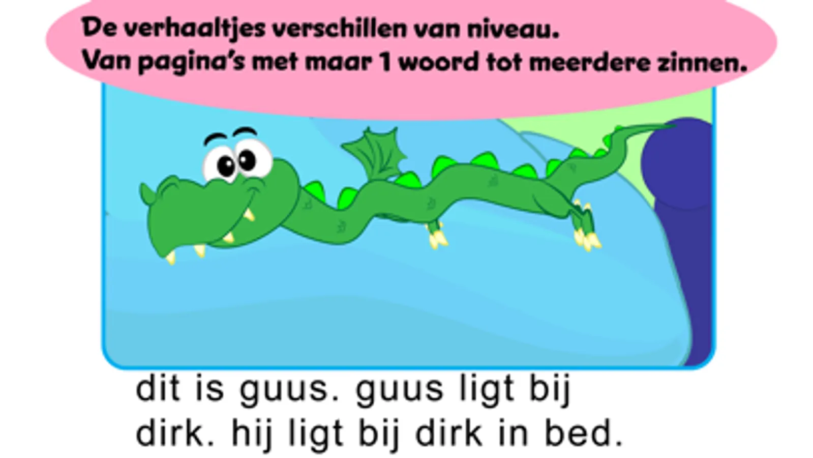 De verhalen in de app kunnen kinderen echt meteen zelf lezen. De verhalen bevatten veel illustraties die de tekst ondersteunen. De tekst is geschreven op AVI START-niveau. Dat betekent dat de woordjes kort en simpel zijn en worden uitgesproken zoals je ze schrijft.