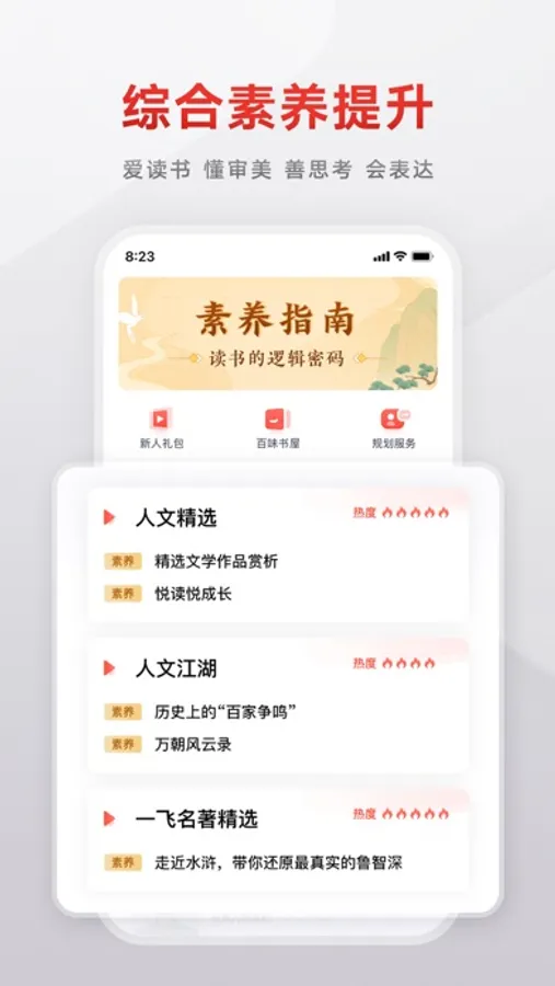 【文学】:中国故事带你领略先秦文学,致敬经典培养语言表达力;四方采风带你学习历史文物、传统风貌、名家名篇感悟地域特色;高端文学带你重温文学著作,解读作品看世界;博物美哲带你走进博物馆了解中国传统文化魅力!