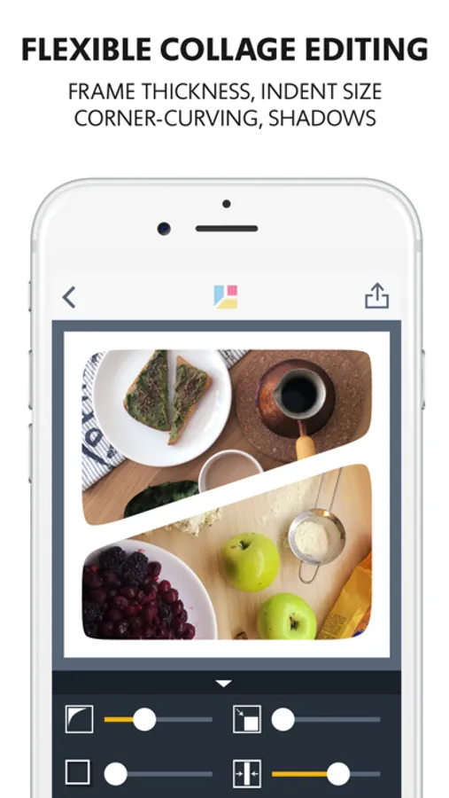 - Flexible collage editing: change frame thickness, indent size, corner-curving, shade adding;