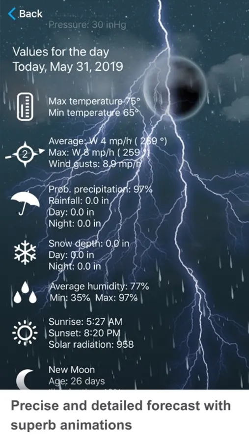 - Detailed forecasts on rain, ice, snow, fog, wind, storm, dew point, UV index, humidity, pressure