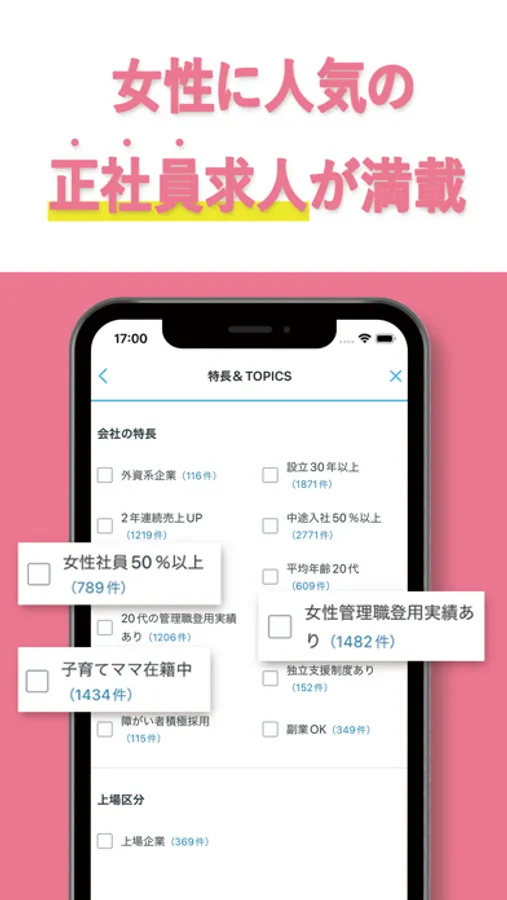 ・特長(未経験歓迎、学歴不問、土日祝休み、残業殆どなし、女性社員50%以上など)