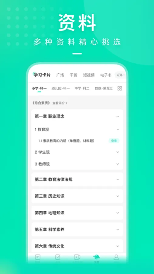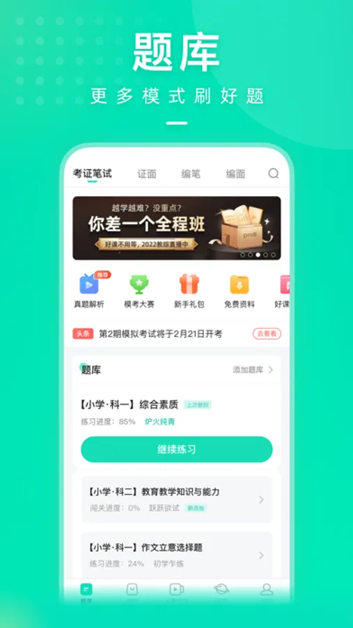 覆盖教师资格证、教师招聘各学段考试科目(语数外音体美幼),闯关刷题攻克考点,笔试面试二合一,科学高效备考教师资格证教师招聘!