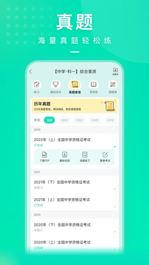知识卡片速记考点+闯关游戏化通关客观题+词条背诵搞定主观题+名师直播课听干货+主观题及视频作业强化训练,还有错题集,夜间模式等贴心功能哦。