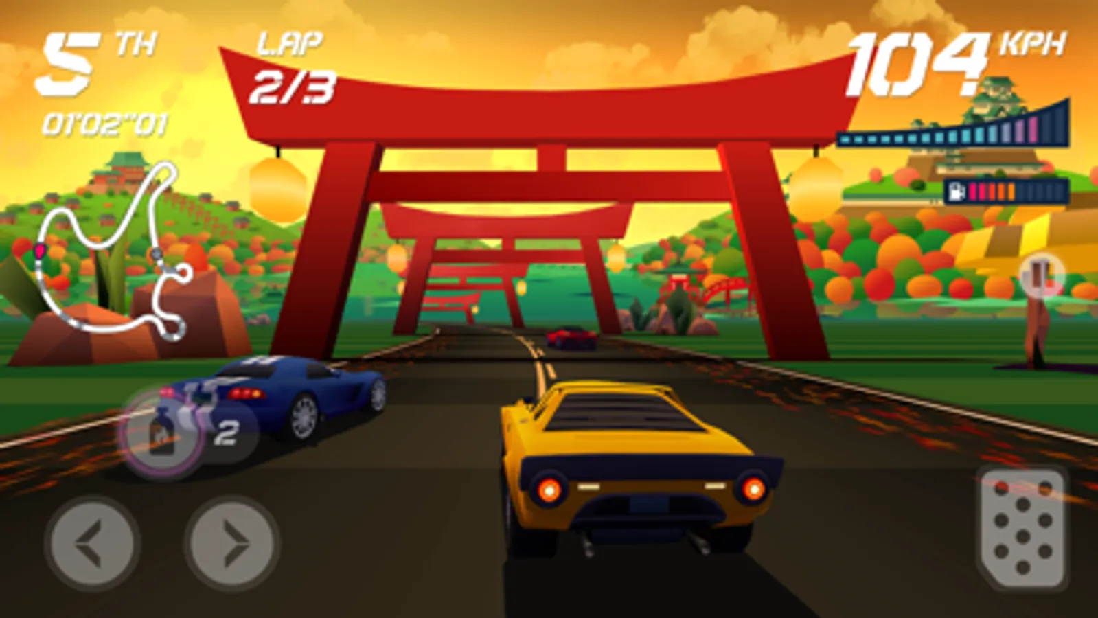 Horizon Chase is a race around the world. With each new cup you'll drive your car through extraordinary races, watching the sun setting, facing rain, snow, volcanic ashes and even severe sandstorms. Be it day or night each track takes place in beautiful postcards from across the world.