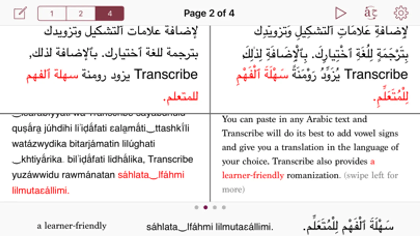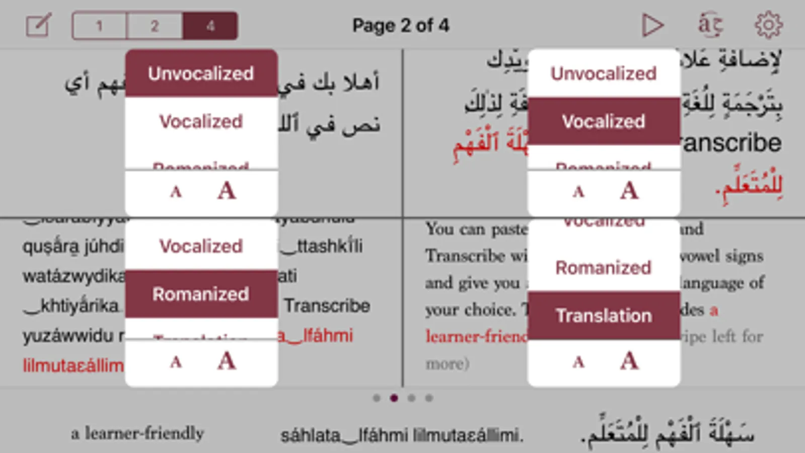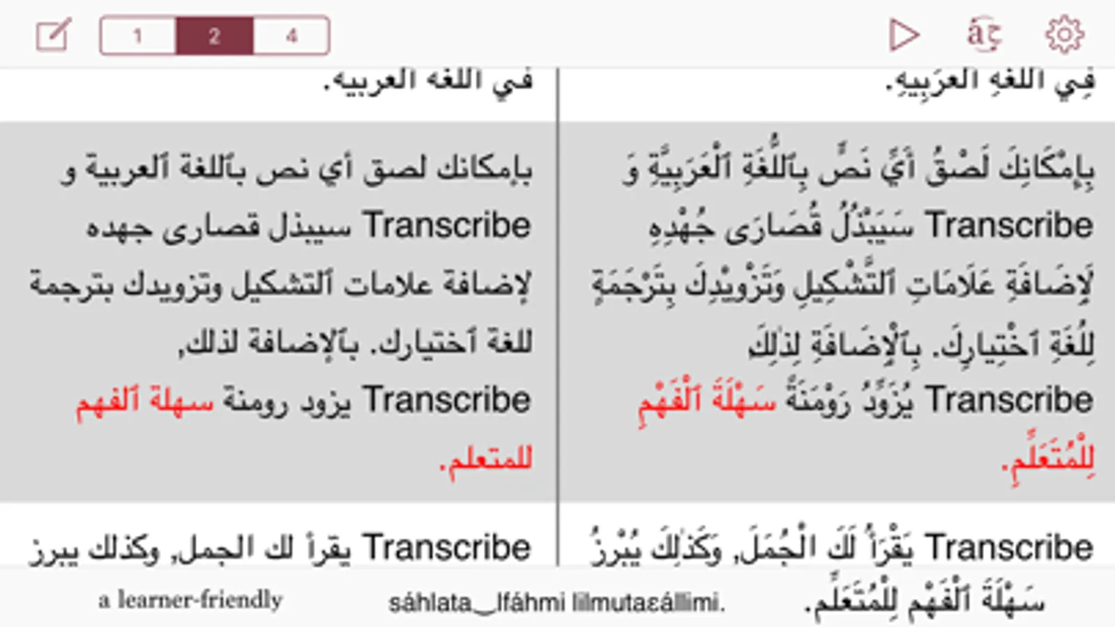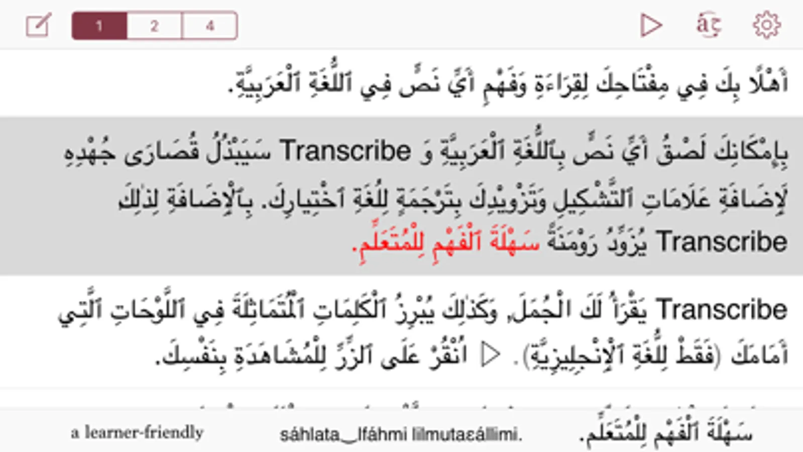 Libera TranScribe provides a high-quality text-to-speech audio feature that allows learners to reinforce their pronunciation while beginning learners can use the audio and romanization to learn to read vocalized Arabic script. For ease of use, corresponding sentences in the various panels are clearly indicated, and the three Arabic texts (unvocalized Arabic, vocalized Arabic and romanized Arabic using our unique CARS system), and the corresponding audio are precisely linked at the word level. This means that tapping on a word in one text simultaneously highlights the linked word in each of the other texts and optionally plays the audio for that word.