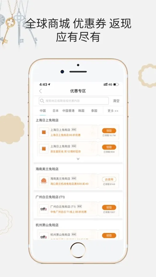目的地商城:20余个热门旅游国家、50余个免税店和商场全覆盖!日上免税店、新罗免税店、乐天免税店、泰国皇权免税店、友都八喜、老佛爷、梅西百货、奥特莱斯…打折信息、折扣价格、优惠券、机上免税、环球蓝联/联合货币兑换…你想要的都在这儿!